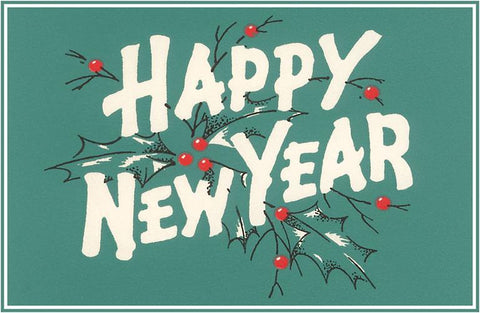 HN-81 Happy New Year, Holly on Blue-Gray Background - Vintage Image