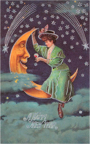 HN-94 A Happy New Year, Victorian Woman on Moon - Vintage Image