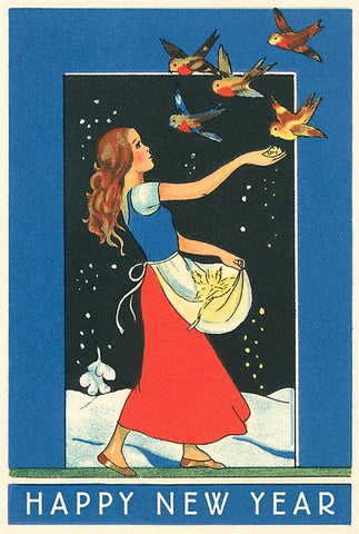 HN-164 Happy New Year, Match Girl Feeding Birds - Vintage Image