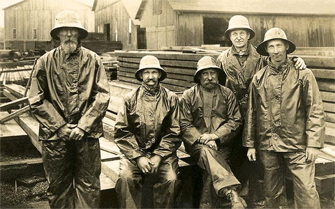IF-107 Lumberyard Workers in Rain Gear - Vintage Image